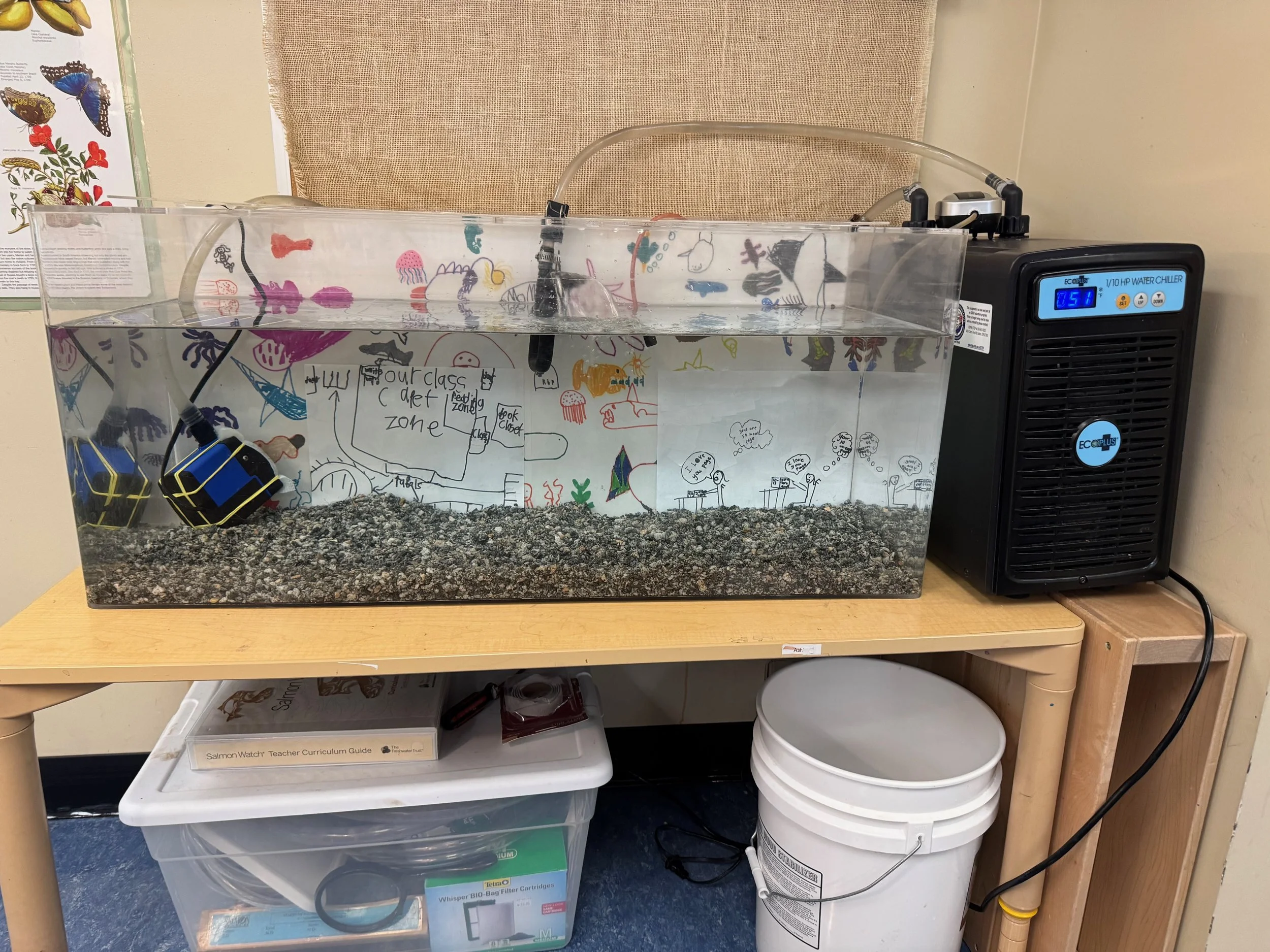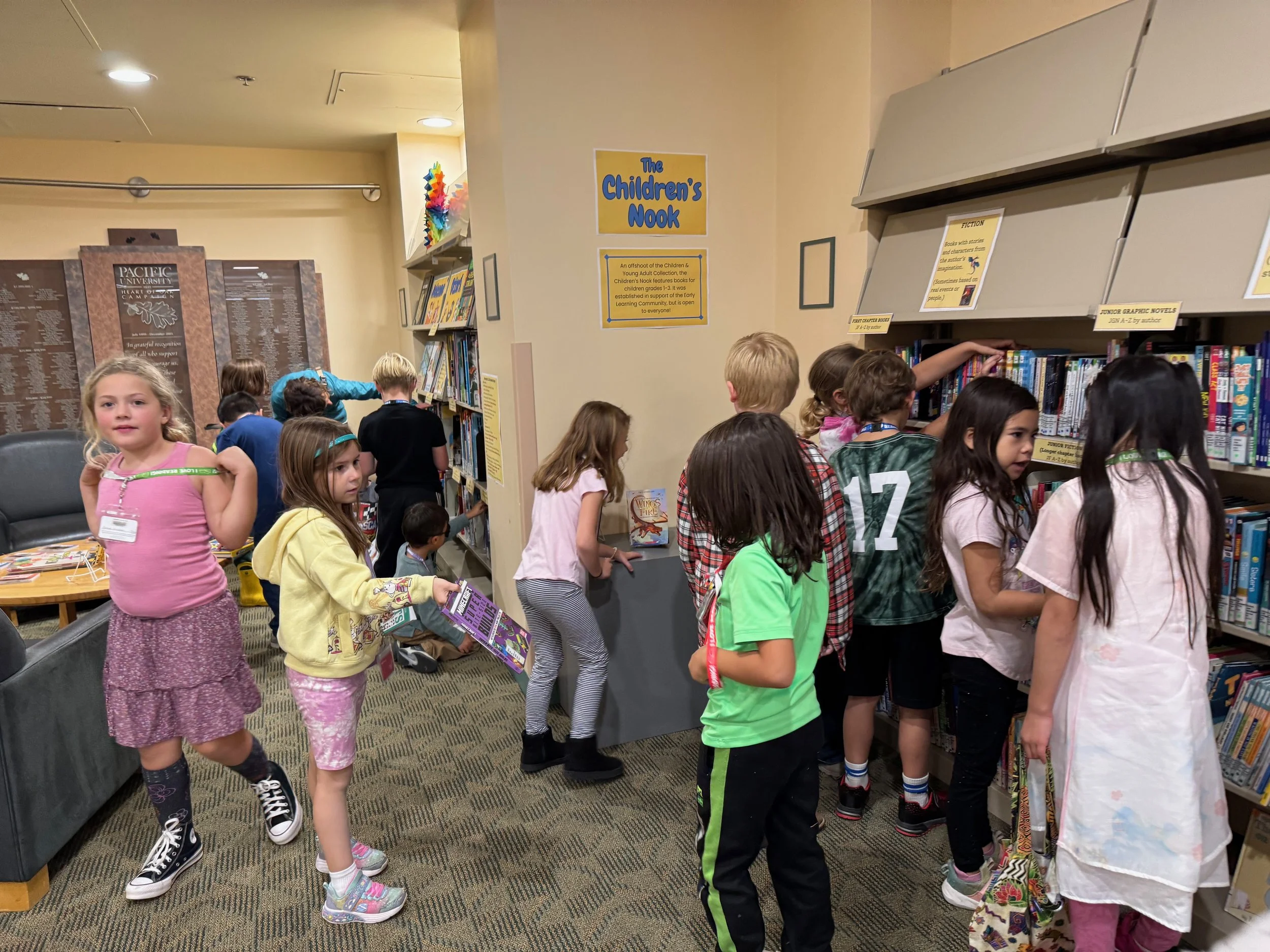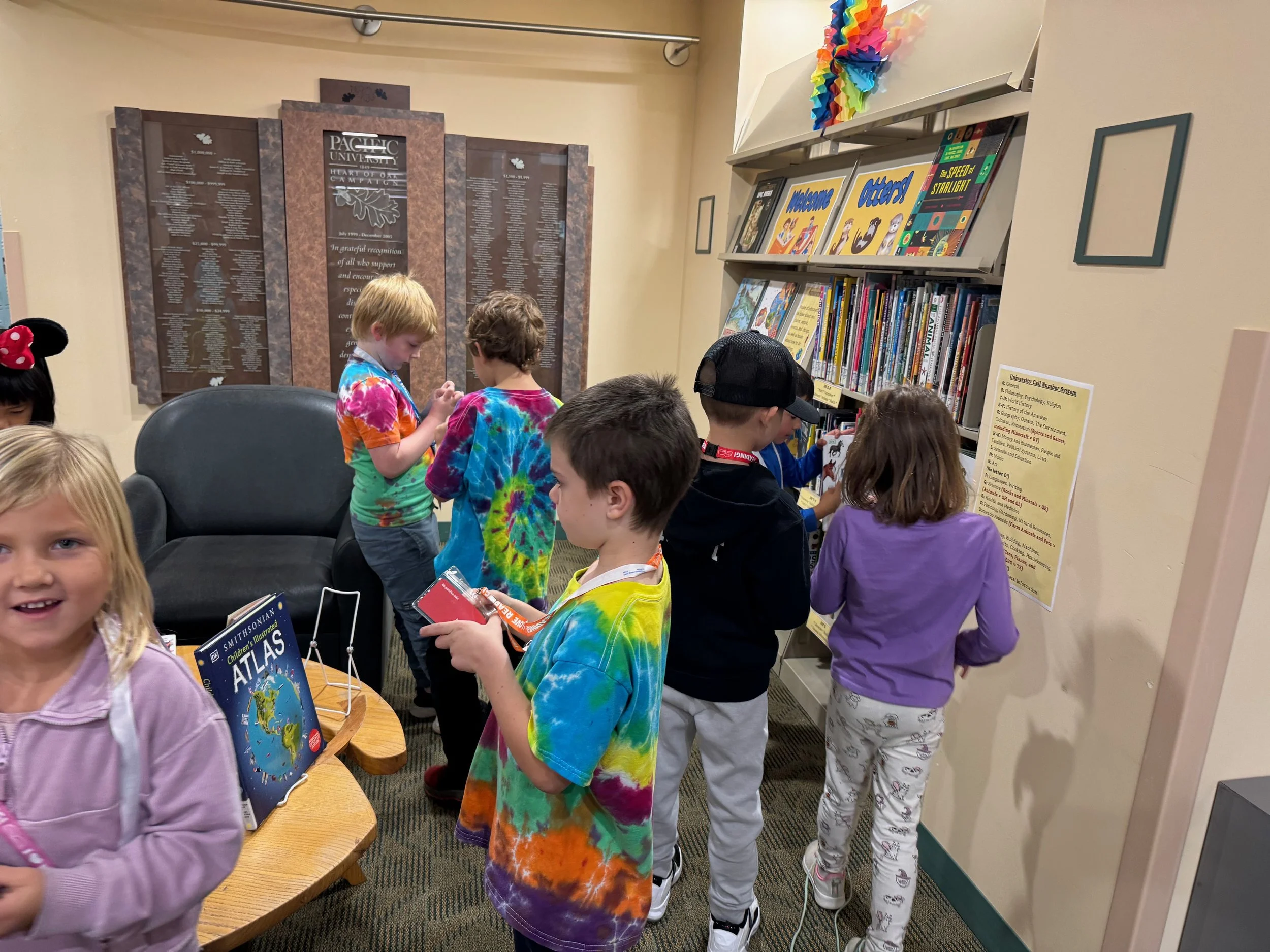 Our fish tank is now all set up and ready for the arrival of our 200 salmon eggs next week. Students are eager to begin this exciting new science project. We also took a trip to the Pacific University Library, where students checked out fresh new books to enjoy.